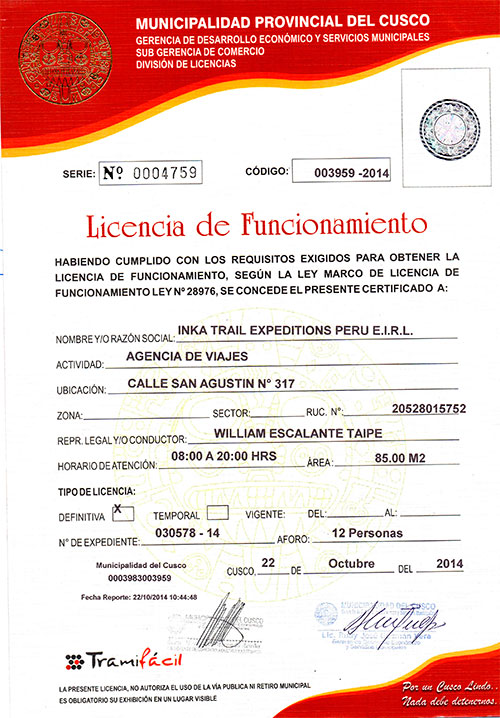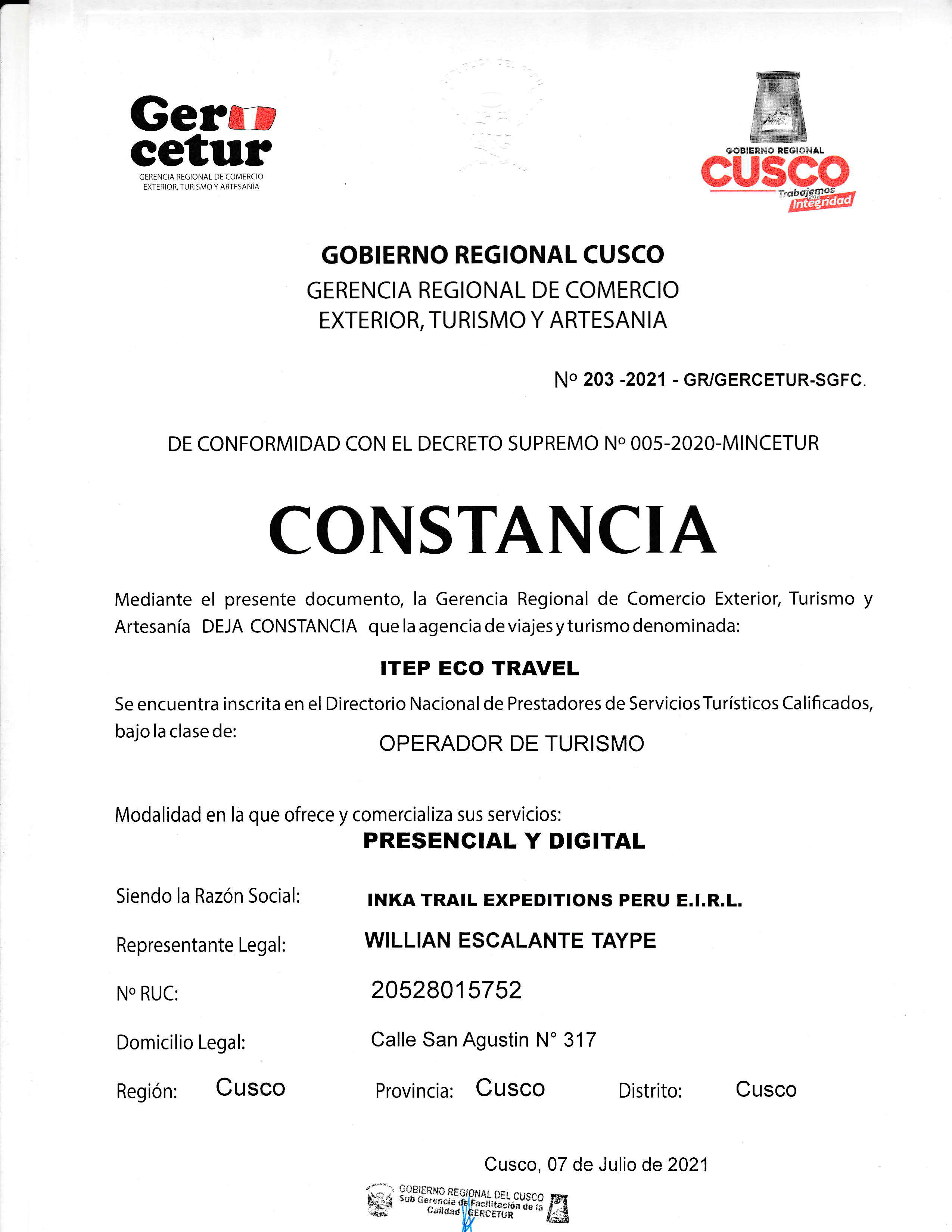 Inka Trail Expeditions Peru E.I.R.L. is an authorized travel agency and tour operator in Peru, specialized in organizing unique tours and treks, such as the emblematic Inca Trail and visits to Machu Picchu. With our RUC number 20528015752, we offer a wide range of customized tours, designed to guarantee unforgettable experiences in Peru's most impressive destinations.